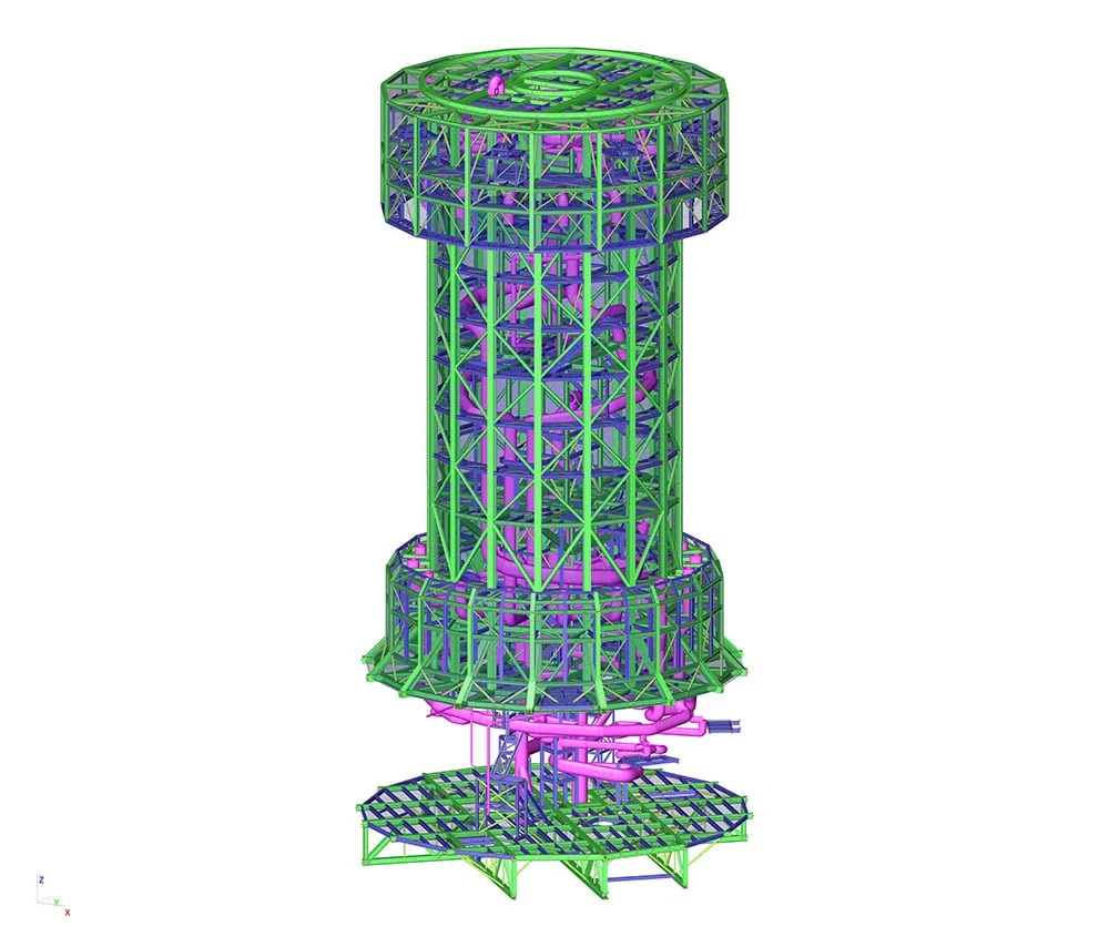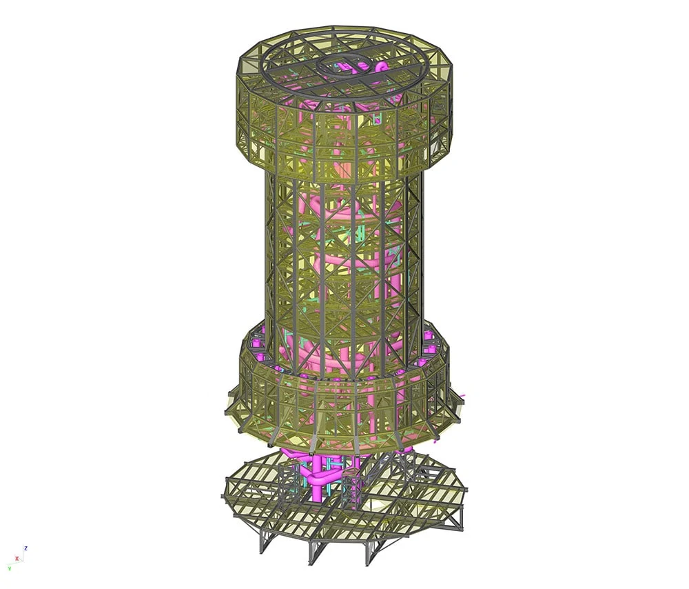 Structura MSR va fi montată la nivelul terenului și apoi va fi așezată pe poziție la partea superioară a turnului de beton. De aceea s-a decis realizarea unui model analitic paralel unde punctele de ridicare au fost modelate cu resorturi neliniare și discutate, pentru validarea comportării, cu o companie de specialitate din Italia – Fagioli.