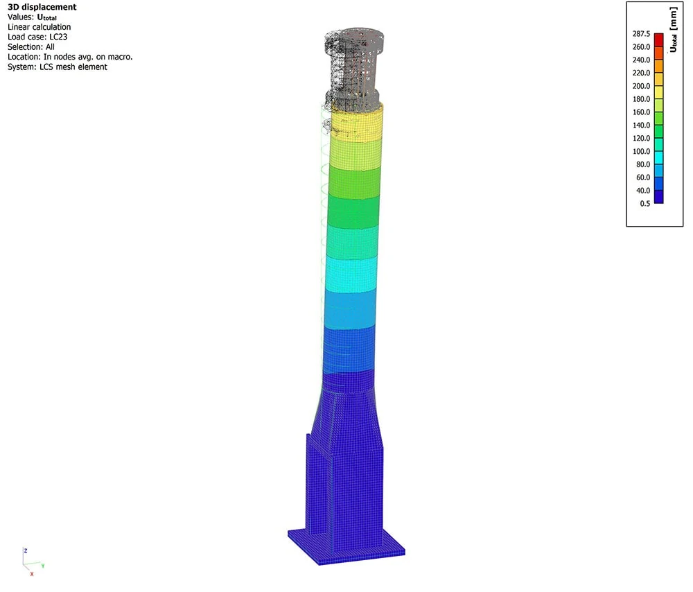 Pentru a putea lua în calcul și a evalua toate încărcările, condițiile seismice ale amplasamentului și instabilitățile aerodinamice a fost necesară modelarea întregului turn. Suporturile de la baza turnului au fost modelate precum constante de resort, considerând rigiditatea acestora echivalentă cu cea a piloților de beton prevăzuți în ca sistem de fundare. Pentru realizarea combinațiilor și verificărilor structurale au fost utilizate standardele IBC.
